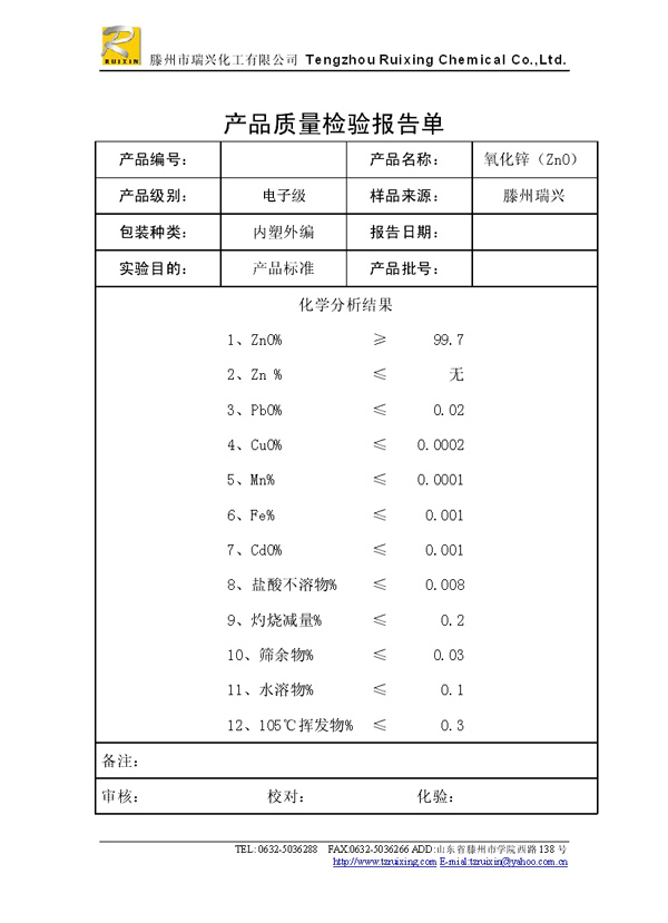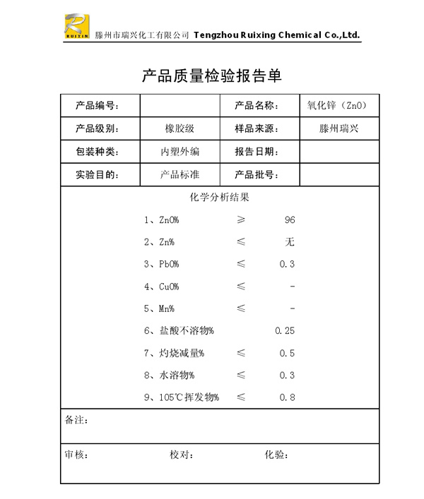 瑞興化工有限公司是生產(chǎn)氧化鋅的重點企業(yè),于2008年通過ISO9001:2008質(zhì)量管理體系認證?!叭鹋d”牌氧化鋅在國內(nèi)擁有較大穩(wěn)定的市場,并遠銷東南亞、中東、中南美等國家和地區(qū),在國內(nèi)外享有較高聲譽。